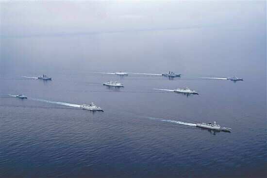 ■在日本海某海域进行的“北部·联合-2023”演习中,中俄参演舰艇编队开展海空护航演练。新华社发 |