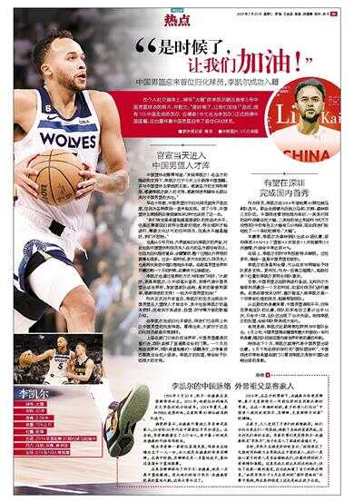 “是时候了,让我们加油!” 在个人社交媒体上,绰号“大锤”的李凯尔晒出身穿5号中国男篮球衣的照片,并配文:“是时候了,让我们加油!”至此,拥有1/8中国血统的凯尔·安德森(中文名为李凯尔)正式获得中国国籍,这也意味着中国男篮迎来了首位归化球员。 李凯尔 绰号:大锤 年龄:30岁 身高:2.06米 体重:104公斤 位置:前锋 生涯:2014年首轮第30顺位被马刺选中 效力:马刺、灰熊、森林狼 出场:574场NBA常规赛 官宣当天进入中国男篮人才库 中国篮协在微博写道:“欢迎李凯尔!在各方的推动和支持下,李凯尔已于今天上午获得中国国籍,并与中国篮协主席姚明见面。感谢各方的支持和帮助,感谢李凯尔家人的支持,感谢球迷和媒体长期以来对中国男篮的关注。” 早在十年前,中国男篮对于归化球员就持开放态度,但因为各种原因一直未能实现。到了今年,中国篮协主席姚明在接受媒体采访时也谈到了这一点。 “我们肯定是希望能提高国家队的技战术水平,但是还需要回归到符合国家的规定,符合规则才能进行,需要文化认可的任何球员,但是水平越高越好,我们不拒绝。” 也是从今年开始,外界就有归化李凯尔的声音,对此包括中国篮协和球员本人在内的各方都没有否认。但因为归化程序复杂、步骤繁琐,整个过程比外界想的要漫长很多。过去一段时间,多方为此努力,球员本人也是两次来到中国办理相关手续。在距离男篮世界杯开赛还剩一个月的时候,此事终于尘埃落定。 李凯尔也通过视频的方式与球迷们问好:“大家好,我是李凯尔,今天很高兴宣布,我将代表中国男篮出战世界杯,身披国家队战袍,是我的骄傲和荣幸,感谢球迷的支持!一起为中国男篮加油!” 昨天正式对外官宣后,李凯尔的名字出现在中国男篮五人篮球人才库当中,其中包括李凯尔的基本资料,还有关于其进攻、投篮、防守等方面的数据介绍。 在李凯尔完成归化手续后,球迷们已在网上热议中国男篮的先发阵容。看得出来,大家对于这名归化球员都是非常期待。 上届在家门口举办的世界杯,中国男篮遭遇沉重打击,球队丢掉了直通奥运会的门票。一个月后再战世界杯,球队希望能够打一场翻身仗,力争拿到巴黎奥运会的入场券。李凯尔的加盟,将会给予队伍很大的支持。 有望在深圳完成国内首秀 作为球员,李凯尔在2014年首轮第30顺位被马刺队选中。职业生涯曾先后效力马刺、灰熊、森林狼三支队伍。中国球迷看到他颇为亲切,一来其打球的动作很像在抡大锤,二来他的举止和动作与《万万没想到》中的角色王大锤有几分相似,因此球迷们给他起了一个亲切的绰号:“大锤”。 本赛季,李凯尔为森林狼队出战69场比赛,场均得到9.4分5.3个篮板4.9次助攻1.1次抢断和0.9次盖帽,外线命中率达到41%。 在场上,李凯尔的防守和投射特点鲜明。过往多年,锋线一直是中国男篮的软肋。 李凯尔的身高和长臂,可以在攻守两端给予球队更多支持。更何况,作为一名锋卫摇摆人,能胜任多个位置的李凯尔更符合球队要求。 目前,中国男篮正在欧洲进行备战,主帅乔尔杰维奇利用最后一个月的时间,加紧对球员们进行磨炼。此前在接受采访时,塞尔维亚人称李凯尔是一个非常有价值的球员,能够帮助球队。 从近期的热身赛来看,中国男篮表现平平,对阵克罗地亚队的比赛,球队的所有后卫累计出手18次,只命中1球,全队还出现了23次失误。相信李凯尔的加盟,会给球队带来很大变化。 有消息称,李凯尔近期将前往欧洲与中国队会合。8月上旬,中国男篮将在德国和意大利参加一系列热身赛,随后队伍返回国内做世界杯前的最后冲刺。 相信在下个月,李凯尔就将代表中国男篮出场比赛。8月下旬在深圳举行的“国际团结杯”,中国球迷非常有希望在家门口看到李凯尔身披中国队战袍出场的身影。 寻根 李凯尔的中国脉络 外曾祖父是客家人 1993年9月20日,凯尔·安德森在美国新泽西出生。2012年,他前往加利福尼亚大学洛杉矶分校读书。2014年夏天,参加NBA选秀的他,在首轮第30顺位被马刺队选中。 据资料显示,安德森外曾祖父李崇新是客家人,20世纪30年代由中国前往牙买加谋生。在当地,李崇新娶妻生了三个女儿,其中最小的就是安德森的外祖母玛丽安。 随后李崇新一家前往美国发展,玛丽安在结婚后生下一儿一女,女儿就是安德森的母亲苏珊娜。在高中时期,苏珊娜还是一名篮球选手,参加过美国女子篮球联赛。 后来苏珊娜嫁给了科尔文·安德森,他是一名高中篮球教练。因此他们的孩子凯尔·安德森有极高的篮球天赋,这再正常不过了。 2018年,在各方的帮助下,安德森与母亲苏珊娜、妻子克里斯特尔一同前往深圳龙岗新木新村寻亲。在这一幸福的时刻,家乡的亲人们打出“中国亲人热烈欢迎凯尔、苏珊娜、克里斯特尔回家”的横幅。 在家乡,三人受到了乡亲们的热情款待。他们不仅与亲友们一同祭祖,体验了当地的客家风俗,还与村民们亲切互动。李家长辈们更是将凯尔·安德森取名“李凯尔”,母子也写入了家族的族谱之中。 当时,李凯尔在接受采访时表示:“我母亲花了无数时间和精力去寻找远在中国的家人,我们一度担心家乡的亲人是否会接纳我们,但最终得到的只有热情和温暖。这里是我之前从未到过的地方,但给了我家一般的感受,这让我知道了自己的根在哪里。”如果李凯尔于8月在深圳的“国际团结杯”比赛中亮相,那在某种程度
