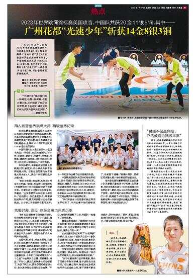 2023年世界跳绳锦标赛美国收官,中国队共获20金11银5铜,其中—— 7月26日上午,征战2023年世界跳绳锦标赛的广州花都队员凯旋!本次跳绳世锦赛于当地时间7月23日在美国科罗拉多斯普林斯收官,中国跳绳国家队累计斩获20金11银5铜,其中来自广州花都的9名“光速少年”一举夺得14金8银3铜,并打破两项世界跳绳纪录。 ■采写:新快报记者 林翠珍 ■图片:新快报记者 左百村 实习生 陈芝冕 七星小学 声音 “‘光速少年’是对我们的一种肯定,也是一种荣誉,但更大意义是,乡村的孩子也应该有梦想,敢于去追梦,通过我们的努力实现为国争光的梦想。”——赖宣治教练 两人新晋世界跳绳大师 两破世界纪录 本次比赛是国际跳绳联合会成立以来举办的首场线下世界跳绳锦标赛,也是世界跳绳锦标赛历史上规模最大、参赛范围最广的比赛,是世界最高水平的跳绳盛会,全球有27个国家和地区的1200余名运动员参加。 中国代表队的21名运动员中,9名选手来自广州花都,分别为唐颢凡、岑小林、张崇杨、谢凯宇、陈嘉伟、陈鸿翔、陈楚淇、曾淑婷、茹锶琪,他们年龄在12岁到19岁之间,分别参加35个项目角逐。 本次比赛中,张崇杨成功卫冕世界跳绳大师,谢凯宇、岑小林成为新晋世界跳绳大师。目前全国范围内世界跳绳大师共有6人,来自广州花都的选手占据4席。 “我的目标是4枚金牌,其他项目没有太大把握。”获得6枚金牌、3枚银牌和1枚铜牌的岑小林已经超额完成了预期目标。尽管在这个过程中他也很紧张,笑着说:“出发前感觉站在地板上都在抖。”但他明白,自己是老队员,需要承担起带头作用,要及时调整状态去迎接挑战。从小学二年级到现在高考完毕,十一年的坚持诠释了他对跳绳的热爱。 中国跳绳国家队共四次打破世界纪录,其中花都队员打破两项世界纪录。谢凯宇、唐颢凡、张崇杨、岑小林以900次的成绩夺得男子组4×30秒交互绳接力冠军并打破世界纪录;岑小林、谢凯宇、张崇杨以464次的成绩斩获男子组60秒交互绳金牌并再次破世界纪录。 “我们早就有计划想要打破这两项世界纪录了,本次比赛中他们都做到了,没有留下遗憾。”跳绳队领队、花都区花东镇七星小学体育老师赖宣治说。 首次参加国际赛事便收获五金的最小队员唐颢凡看起来十分冷静,在开赛前,他的目标是打破“4×30秒单摇接力的世界纪录”,最终,他以848次的成绩获得了冠军。虽然未能打破世界纪录,但年仅12岁、跳绳跳了4年的他说:“很高兴能够在第一次参加国际比赛就获得了世界冠军,接下来会更加努力。” 克服时差、高反 收获金牌也完成历练 “我们已经提前做了倒时差的训练,但没有想到科罗拉多是一个小高原,海拔在1800米以上,走在路上都会喘气,这给我们的队员带来了巨大的考验。”赖宣治教练介绍到,队员们到达后都有对比赛场地和气候的不适,模拟测试时的成绩远不及训练时,而留给他们的只有两天时间调整。 克服气候、饮食、时差的困难,花都队员们在比赛中大放异彩,但也留下了不少的遗憾,虽然在最强的项目“3分钟单摇”中拿下三金,但最有可能破纪录的项目却未能如愿,在交互绳花样比赛中也屡屡失误,今年初二的陈鸿翔因为“一个之差”与金牌失之交臂,泪洒赛场,她说:“不甘心,最后几秒钟身体已经很累了,失误了两三次,原本夺冠的希望很大的,我从来没想过会错失这枚金牌。”不过,她很快便调整了心态,和团队一起拿下了其他比赛。 赖宣治教练表示,“遇到挫折也许并不是坏事,我们不单单要看到孩子拿金牌的一面,也应该看到他们敢于去面对挫折,重振士气的一面。” 此次组建的队伍采用了“以老带新”的模式,这支由5个老队员以及4个新队员组建的队伍里,有首次参加比赛的队员,也有可能是最后一次参加比赛的队员,有因为学业许久未曾训练的老队员……尽管适应磨合期较短,但他们毅然挑起重担,拼命练习。赖宣治说:“因为他们足够努力,所以能够取得好成绩。” “对于比赛结果已经非常满意,展示了花都少年敢于拼搏、敢于进取的优良作风。”在比赛过程中,赖宣治也发现其他对手已经追赶上来,接下来将不断总结提升,同时他表示,“更快、更高、更强是我们终身奋斗的目标,我们会顶住压力,不断训练加强优势、取长补短。” “跳绳不仅是竞技, 它的教育内涵很丰富” 昨日,迎接花都跳绳队员的同学是队伍的后备队员,七星小学除了平时利用素质训练营培训学生,假期也会有一些集训活动,包括跳绳和足球集训。七星小学处处可见挂满跳绳的“绳树”,对于该小学来说,跳绳是一种信念。本次出征世锦赛的9名队员,其中8人是从七星小学走出来的,还有一人是七星教育集团秀塘学校输送到花东学校的运动员。 提起这些从七星小学走出去的少年们,七星小学校长魏燕平感慨道:“岑小林今天表现出来的自信大方,张崇杨的谦逊有礼,唐颢凡的朝气蓬勃,这些都是跳绳运动带给他们的变化。”他表示,在学校中跳绳不仅仅是一项竞技项目,它包含的教育内涵很丰富,我们希望孩子们通过这个项目获得成功感,从而建立更大的自信,也希望孩子们通过不同的磨练获得体验感,感受“热爱”的魅力和“奋斗”的力量,同时更希望学生们能够继续传承为梦想努力奋斗的“七星精神”。 数说 近年来,花都跳绳队员在全国跳绳比赛、亚锦赛、世锦赛中争金夺银,截至本次赛事前,累计培
