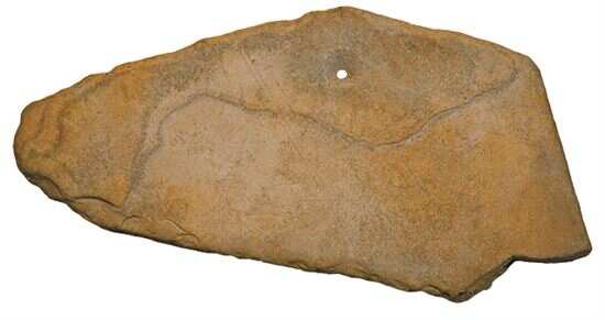 ■商周小石磬,成都金沙遗址博物馆藏。长76,宽36.5,厚3.5厘米。蛇纹石,灰色。整体平面略呈不等边梯形,器形较大,近顶部一圆孔,孔径较小,孔壁留有单面管钻痕迹,直面,边缘不甚规整,器身上有两道弦纹,尚能奏出音符,音质纯美悦耳。 |