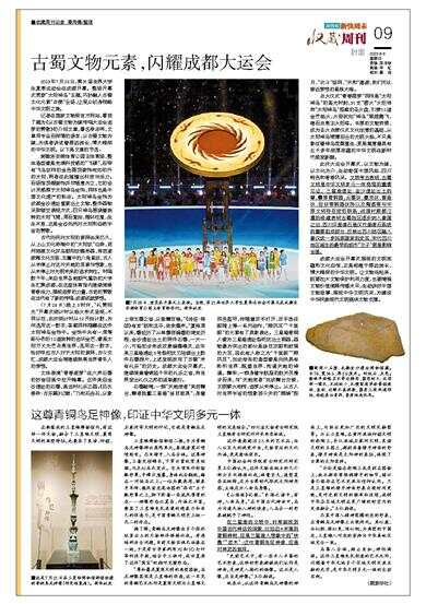2023年7月28日,第31届世界大学生夏季运动会在成都开幕。整场开幕式贯穿“太阳神鸟”主题,巧妙融入古蜀文化元素“点燃”全场,让观众切身领略中华文明之美。 记者在国家文物局官方网站,看到了题为《以古蜀文物为媒传唱大运会追梦的赞歌》的介绍文章,署名李志伟,文章用专业而深情的语言,以古蜀文物为媒,为读者讲述着源远流长、博大精深的中华文明。以下是文章的节选: 俯瞰东安湖体育公园主体育场,整体造型像是充满科技感的“飞碟”,而带有飞鸟纹样的金色圆顶装饰宛如初升的太阳,两者在此碰撞出科技与活力。而场馆顶棚装饰并非随意为之,它的设计灵感源于太阳神鸟金饰,同样也是中国文化遗产的标志。太阳神鸟金饰为成都金沙遗址重要出土文物,整件器物采取镂空表现方式,四只神鸟围绕着旋转的太阳飞翔,周而复始,循环往复,生生不息,这是金沙先民对太阳和自然宇宙的赞歌。 古代先民对太阳的崇拜由来已久,从上山文化彩陶中的“太阳纹”白彩,到河姆渡文化双鸟朝阳纹蝶形器,再到凌家滩文化玉版、玉鹰中的八角星纹,古人从未停止对这片天地的思索与想象,也从未停止对光明未来的追求向往。时隔数千年,来自世界各地朝气蓬勃的大学生汇聚成都,在这座体育馆内继续演绎青春活力,展现追梦的力量,古老的赞歌在当代有了新的传唱:成都成就梦想。 (7月28日)晚上8时许,“礼赞阳光”开幕式倒计时以焰火形式呈现,不同以往,此次倒计时从12开始计数,为何选用这一数字,答案同样隐藏在这件太阳神鸟金饰中。金饰中央有一周等距分布的12道旋转的齿状金芒,像是太阳万丈光芒点亮世界,选用这一数字,恰好呼应古人对于太阳的崇拜,古今交汇,成都大运会将继续照亮世界青年人的梦想。 文体表演“青春逐梦”在六声石磬的妙音回荡中拉开帷幕。这件来自金沙遗址的石磬,是当时礼乐之器。《吕氏春秋·古乐篇》记载:“乃拊石击石,以象上帝玉磬之音,以致舞百兽。”《诗经·商颂》有言“既和且平,依我磬声。”夏商周以来,磬经历了从单磬到编罄的演变历程,金沙遗址出土的两件石磬,一大一小,可能初步形成双悬编磬模式,近年来三星堆遗址8号祭祀坑又陆续出土数件石磬残片,上述发现改写了古蜀“未有礼乐”的历史。成都大运会开幕式,继续演奏着绵延千年的礼乐之音,向世界发出礼仪之邦的诚挚邀约。 石磬敲响,一群“天地使者”来到舞台,舞者脸戴三星堆“纵目面具”,身着同色盔甲,伴随着双手打开、双手放在眼睛上等一系列动作,“顺风耳”“千里眼”的元素有了具象表达。三星堆青铜人像为三星堆遗址祭祀坑出土铜器,器物最为突出的部分是纵目双眼和舒展的大耳,因此有人称之为“千里眼”“顺风耳”,如此夸张的造型像是先民具有聆听世界、眺望世界、沟通天地的神通。舞毕,一群身着宇航服的航天员漫步而来,与“天地使者”完成舞台交接,文明薪火相传,追梦从未停止。从古人对世界宇宙的想象到今天的“嫦娥”探月、“北斗”组网、“天和”遨游,我们无比接近梦想的星辰大海。 点火仪式“青春圆梦”同样是“太阳神鸟”的高光时刻,31支“蓉火”火炬伸向“太阳神鸟”图案的圣火盘,引燃12道金芒焰火,火苗犹如“神鸟”展翅腾飞,继而点亮主火炬塔。丰厚的文物资源,成为圣火点燃仪式文化创意的基础,从太阳神鸟喷薄而出的光明火焰,不只是象征着神鸟涅槃重生,更是寓意着具有五千多年深厚底蕴的中华文明在新时代焕发新颜。 此次大运会开幕式,以文物为媒,以文化为介,生动彰显中国风格、四川特色和青春风采。文物考古表明,古蜀文明是中华文明多元一体格局的重要见证。三星堆遗址、金沙遗址出土的尊、罍等青铜器,云雷纹、夔龙纹、兽面纹、回纹等铜器纹饰以及陶盉等与中原文明存在密切联系,战国时期都江堰的修建表明古蜀地区逐步纳入秦国之治,四川汉画像石是汉代画像石系统的重要组成部分,反映出四川地区融入秦汉统一多民族国家的史实,宋代四川地区诞生的最早的纸币“交子”更是影响全国。 成都大运会开幕式展现的文明底蕴和文化自信,正是根植于源远流长、博大精深的中华文明。让文物活起来,既要加大文物保护利用力度,也要增强文物价值阐释传播水平,生动讲好中国文物故事、展现中华文明风采,为建设中华民族现代文明提供文物支撑。 ■收藏周刊记者 潘玮倩/整理