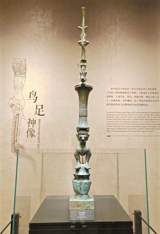 ■这是7月21日在三星堆博物馆新馆拍摄的青铜鸟足神像(研究性复原)。新华社发 |