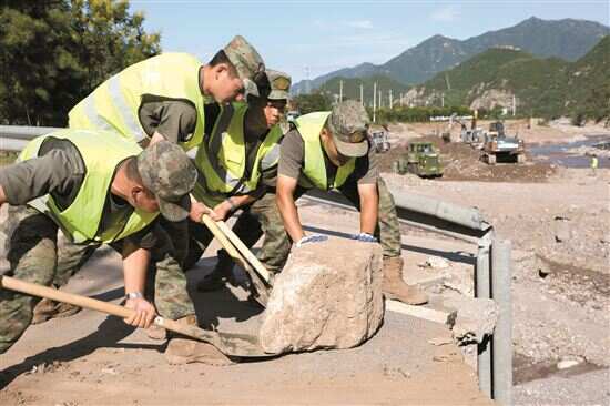 ■中部战区陆军第82集团军某工兵旅官兵在北京市昌平区流村镇清理道路(8月5日摄)。新华社发 |