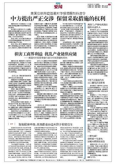 ——美国对外投资审查行政令引发质疑和担忧 据新华社电 美国政府9日发布对外投资审查行政令,限制美方对中国高科技领域投资。国际观察人士认为,美方行为违反市场经济和公平竞争原则,破坏国际经贸秩