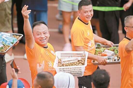 ■8月13日,贵州榕江美食足球友谊赛(第一季)在贵州省榕江县开打。作为“村超”足球赛的延续,来自全国各地的近300支球队将在展示球技的同时推广当地美食文化。图为广西大学甘蔗汁队球员在入场时展示当地美食。新华社发