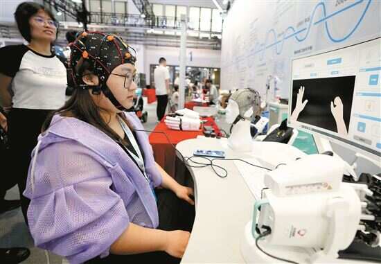 ■工作人员在演示脑机接口智能治疗系统平台。该机器人应用于中风患者手部康复治疗。 |