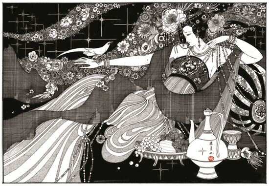 ■《一百仕女图》中的杨贵妃,图中大小不一、密密麻麻的点,流畅潇洒、密不透风的线,全是一笔一笔手绘的,看起来十分震撼,让人不由得感叹卢延光炉火纯青的笔尖功夫。 |