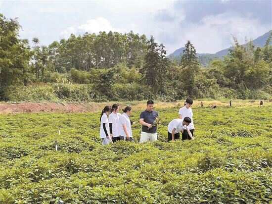 ■广州新华学院微丁香志愿实践队的队员们在溪黄草种植基地调研。 |