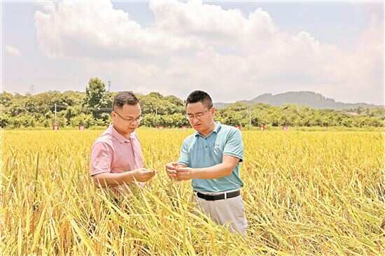 ■队长王向阳和队员李豪杰(左)察看中山-磷溪稻蔬轮作示范基地水稻长势情况。 |