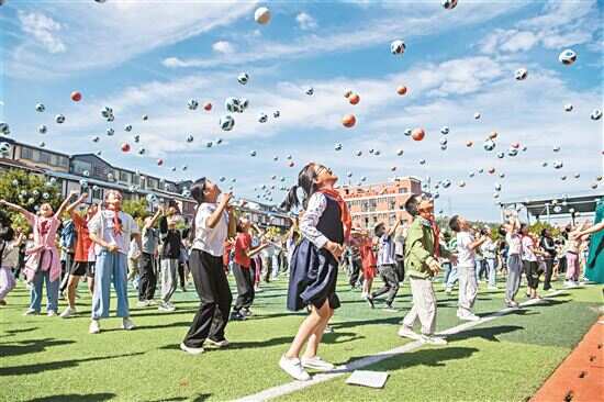 ■9月1日,在重庆市石柱土家族自治县三河镇三河小学,学生们在操场上抛出足球迎接开学。新华社发 |