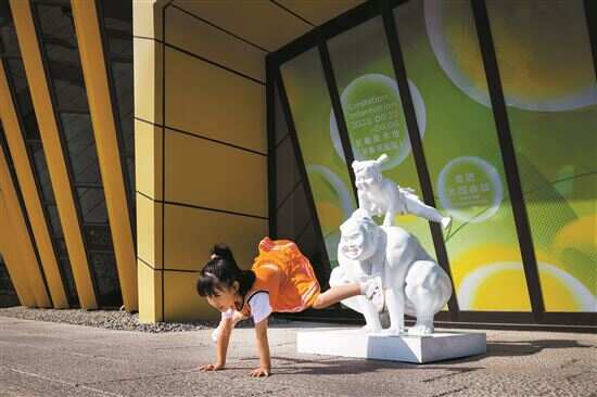 ■展览现场,有小孩跟着雕塑摆动作。 |