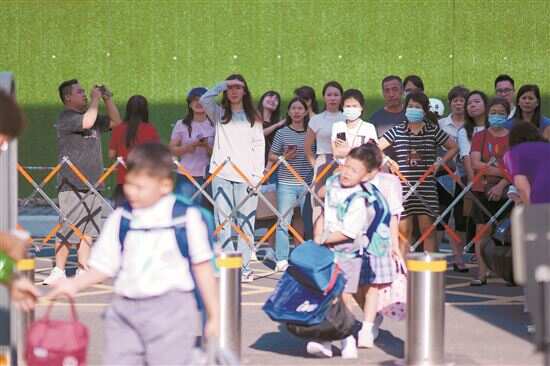 9月4日,环市西路小学(绿森林校区),不少家长在校门口目送小朋友走进学校。 |