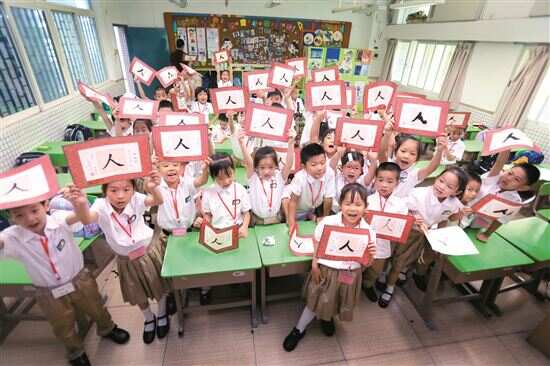 9月4日,在东风东路小学的开学仪式中,老师教一年级新生学写“人”字。 |