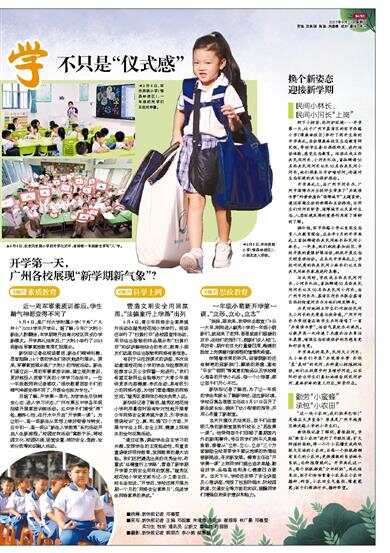 开学第一天, 广州各校展现“新学期新气象”? 关键词 素质教育 近一周军事素质训练后,学生精气神都变得不同了 9月4日,是广州大学附属小学(下称“广大附小”)2023学年开学日。据了解,今年广大附小新生人数翻倍,本学期将开启南北校区同步办学新模式。开学典礼结束后,广大附小举行了2023级新生军事素质教育周汇报展示。 新快报记者在现场看到,新生们精神抖擞,昂首挺胸,16个班的学生们依次地进行展示。原来,军事素质展示是广大附小的传统活动。新生们通过近一周的军事素质训练,建立规则意识,更好地投入到接下来的小学学习生活中。一位一年级教师向记者感叹:“很欣慰看到孩子们的精气神都变得不同了,开班会也较为专注。” 另据了解,开学第一周内,为使学生尽快转变心态、进入学习状态,广州市第五中学各年级陆续开展素质训练活动。五中学子们接受“烤”验、磨炼心性,在汗水中开启“开学第一课”。为让初一、高一级新生从思想上做好衔接与转变,五中初一、高一级以“新生入学教育”系列活动开启人生新旅程。“校园定向活动”寓教于乐,将校园文化、校园环境、场室设置、消防安全、急救、垃圾分类等知识融入活动。 关键词 科学上网 营造文明安全用网氛围,“法德童行上学路”出列 9月4日,青少年网络安全素养提升活动在越秀桂花岗小学举行。现场还举行了“扫黄打非”进校园宣传活动,用非法出版物的样品展示和“扫黄打非”知识讲解相结合的形式,教育小朋友们远离非法出版物和网络有害信息。 有别于以往授课式的讲座,本次活动邀请桂花岗小学的学生与检察院的检察官以及公安网警一起进行。“我们希望互联网企业能够为广大青少年提供更多内容健康、形式生动、具有吸引力的网络内容,为他们营造清朗的网络空间。”越秀区委网信办相关负责人说。 新快报记者了解到,越秀区桂花岗小学利用暑假时段有针对性地开展青少年网络安全素养提升普及,引导学生围绕校训“立、真、和、雅”四个方面,开展与守法上网、安全上网、健康上网相关的金句征集活动。 “通过征集,调动学生自主学习的兴趣,发挥学生的主观能动性,用童言童语做好同伴教育,发挥教育的最大功能。我们还把遴选出来的优秀金句,布置成‘法德童行上学路’,营造了新学期开学要文明安全用网的氛围。”越秀区桂花岗小学党支部书记、少工委主任、校长汤洁说,“开学后,学校还将开展为期一个月的‘网络安全素养月’,促进学生网络素养的养成。” 关键词 思政教育 一年级小萌新开学第一课,“立形、立心、立志” “妹妹,跟我来,我带你去教室!”4日一大早,刚刚进入毓秀小学的一年级小萌新们,就迎来了老师、哥哥姐姐们温暖的双手,在他们的指引下,萌新们步入校门,用好奇、期许的目光打量着四周,稚嫩的脸庞上充满着对新旅程的憧憬和希望。 伴随着凉爽的秋风,迎接萌新的还有鲜艳的迎新拱门、飘扬的彩旗、富有“平安”“聪明”等寓意的物品以及学校精心准备的开学小礼品,每一个小惊喜,都让孩子们开心不已。 新快报记者了解到,为了让一年级的学生和家长了解新学校,适应新环境,学校召集各班班主任在8月27日召开了新生家长会,提供了幼小衔接的指导,并用心布置了新教室。 当天升旗仪式结束后,孩子们在窗明几净的新教室里聆听校长上“思政第一课”。他带领孩子们回顾了暑期国内外的新闻事件,号召同学们向平凡英雄致敬,接着从“立形、立心、立志”三个方面鼓励全校莘莘学子要以饱满的热情迎接新挑战,寻求新发展。德育主任在“开学第一课”上向同学们提出追求卓越、勤奋好学、品格高尚和身心健康四点要求。当天下午,学校还安排了安全讲座及心理讲座,传授了包括防溺水、防校园欺凌、交通安全等方面的知识,提醒同学们增强自我保护意识和能力。 换个新姿态 迎接新学期 民间小林长、民间小河长“上岗” 种下小树苗、巡河护环境……开学第一天,位于广州市荔湾区的环市西路小学(绿森林校区)举行了别开生面的开学典礼,启动绿森林校区生态教育研究院,带领学生参与课程研发、进行活动体验,感受生态教育。活动还成立西关民间河长、小河长队伍,首批聘请50名西关民间河长以及50名西关民间小河长,他们将参与守护增埗河,传递对生态环境的关注保护观念。 开学典礼上,由广州市河长办、广州市海绵办为全校师生带来了“共筑清水梦”科普讲座和“海绵城市”主题宣讲,通过有趣生动的讲解和互动游戏,让师生们对河长职责、海绵城市以及其对生态、人居环境发挥的重要作用有了清晰的了解。 据介绍,环市西路小学以自然生态育人为教育理念,在去年9月的开学典礼上首批聘请西关民间林长和民间小林长。一年来,他们积极参加社区、学校开展的爱绿护绿活动,积极开展生态文明宣讲活动。在本次开学典礼上,学校对优秀的西关民间小林长们以及西关民间林长家庭进行表彰。 与此同时,学校成立西关民间河长、小河长队伍,首批聘请50名西关民间河长以及50名西关民间小河长,由广州市河长办、荔湾区河长办联合荔湾区西村街道河长办为他们颁发聘书。 为更好地树立师生们对担任民间大小河长的光荣感与使命感,广州市河长办带领着在场学生共同演唱了一首“共筑清水梦”,活动气氛欢乐而热烈。以歌声再一