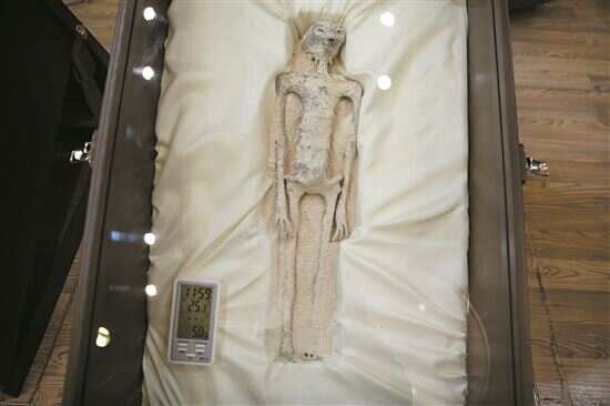 ■在墨西哥国会听证会上展示的两具“干尸”之一,它身体瘦小、每只手仅3个手指、面部扁平。VCG图 |