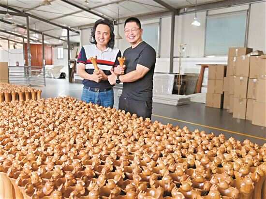 ▲张文(右)与东阳木雕代表性传承人黄小明在制作现场合影。 新华社发 |