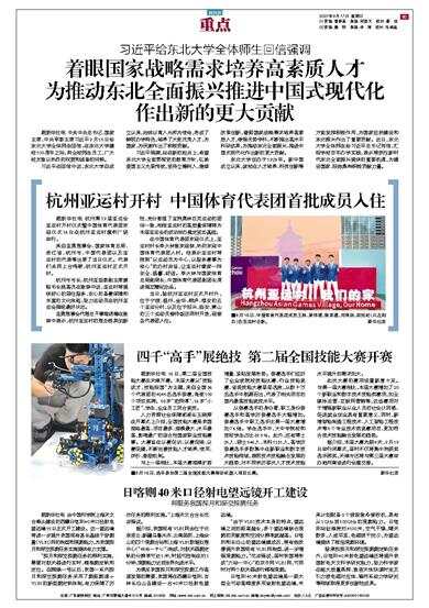 习近平给东北大学全体师生回信强调 据新华社电 中共中央总书记、国家主席、中央军委主席习近平9月15日给东北大学全体师生回信,在东北大学建校100周年之际,向全校师生员工、广大校友致以热烈的祝贺和诚挚的问候。 习近平在回信中说,东北大学自成立以来,始终以育人兴邦为使命,形成了鲜明办学特色,培养了大批优秀人才,为国家、为民族作出了积极贡献。 习近平强调,站在新的起点上,希望东北大学全面贯彻党的教育方针,弘扬爱国主义光荣传统,坚持立德树人,继续改革创新,着眼国家战略需求培养高素质人才,做强优势学科,不断推出高水平科研成果,为推动东北全面振兴、推进中国式现代化作出新的更大贡献。 东北大学创办于1923年。新中国成立以来,该校在人才培养、科技创新等方面发挥积极作用,为国家经济建设和东北振兴作出了重要贡献。近日,东北大学全体师生给习近平总书记写信,汇报学校百年办学实践,表示将抓住新时代东北全面振兴提供的重要机遇,为建设国家、报效桑梓积极贡献力量。