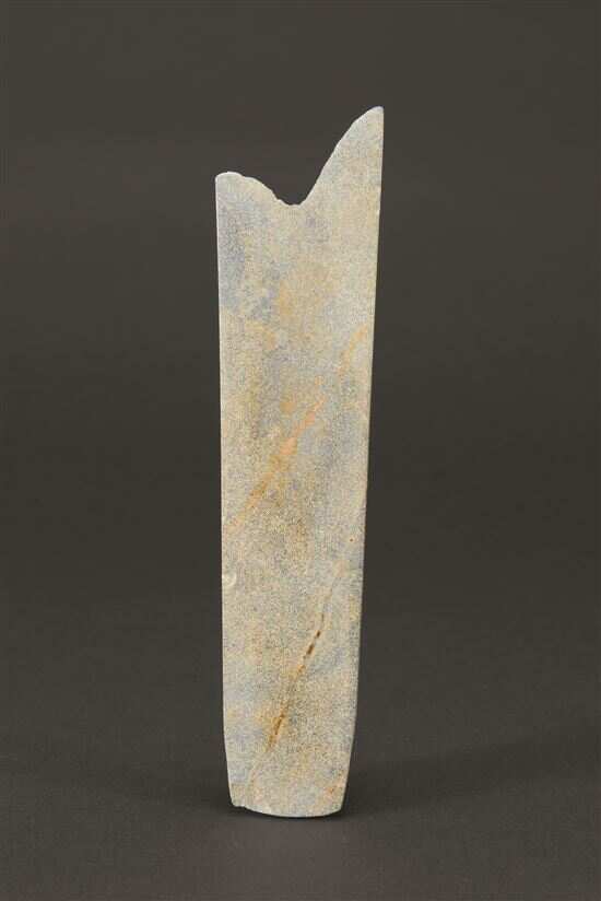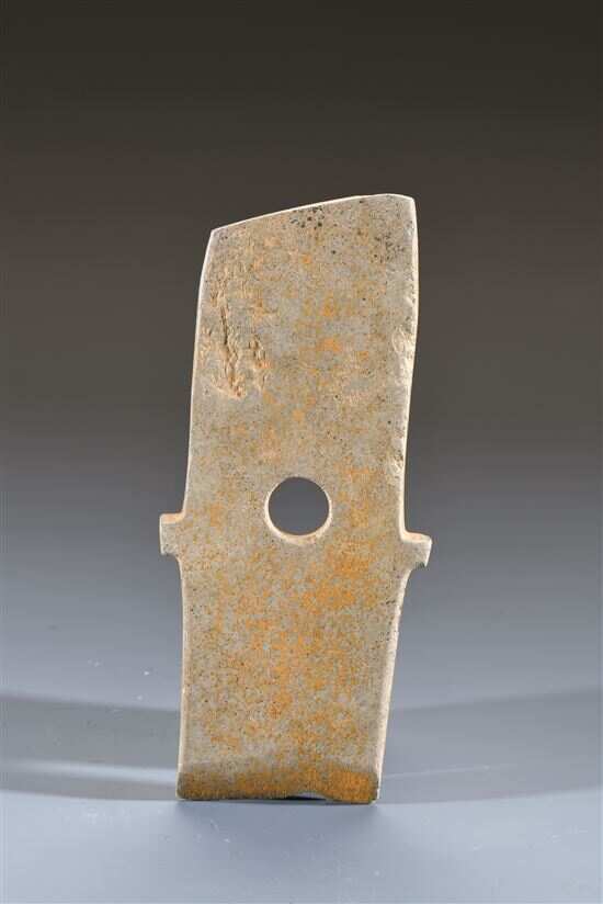 ■石璋,商代,广州黄埔竹园岭遗址出土,广州市文物考古研究院藏。基本完整,器体中部偏下钻孔。两侧有突出的鉏牙。一端有刃,另一端未开刃。通体磨制精细。 |