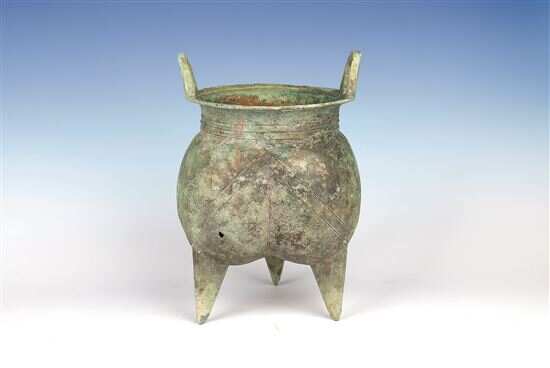 ■弦纹铜鬲,商代,1974年盘龙城李家嘴1号墓出土,湖北省博物馆藏。器物通体经过修整磨光。折沿,口立对耳,鼓腹部,曲底分裆。腹裆部饰三个三角纹,颈部饰三道平行弦纹,国家一级文物。鬲是炊煮器。 |