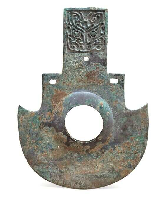 ■铜钺,商代,1989年杨家湾11号墓出土,湖北省博物馆藏。此铜钺内狭短,刃部延展为半圆形,侧角向上翘,平肩。制作精湛,纹饰绮丽,内上部两面均饰一饕餮兽面。钺为砍杀兵器,也可为刑具。青铜钺主要流行于商至西周时期,盘龙城出土的这种钺是政治、军事权力的象征,一般都出土于高等级墓葬中。 |