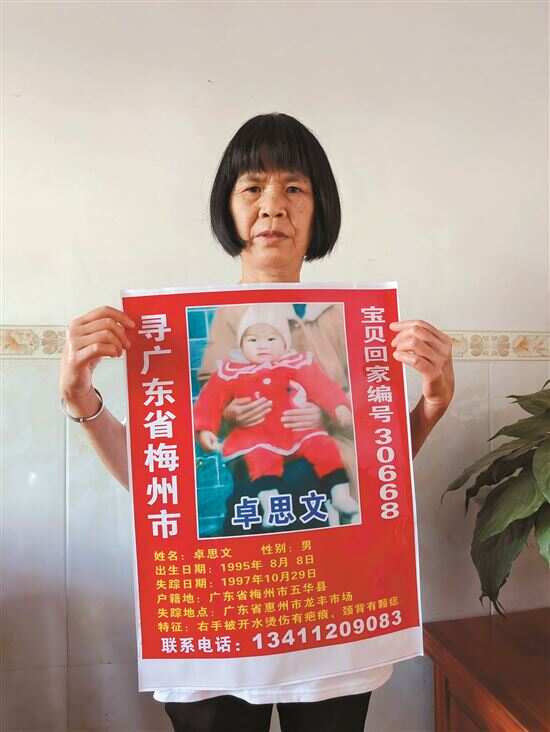 新快报讯 钟添英最遗憾的,是26年前儿子卓思文丢了,她连儿子的一张正面照片都没有。时光流逝中,她有时甚至无法准确地回忆出当初小思文的长相,只能凭着思文姐姐的幼时照片,去寻觅他们眉眼之中的相像。“一转眼的工夫就不见了,26年了我找不到他。如果他好好的,今年应该28岁了……”钟添英一边念叨着,一边看着手边才几个月大的小孙儿,不知不觉,泪流满面。 夫妻离乡摆摊挣钱 在梅州五华的老乡群体里,钟添英夫妻俩应该算是比较早出来做生意的。上世纪90年代,家里的一亩三分地刨不出富足的生活,钟添英决定和其他老乡一起,到惠州看看有没有其他机会。在惠州龙丰市场旁的夜市里,每到黄昏时,钟添英就支起一个卖衣服的夜市摊,这是他们一家人生活的希望。 “多的时候一天也能挣好几百,少的时候几十块,在那个时候,也算挺不错的。”钟添英说,自己勤劳肯干,老公有时候也会来帮忙,生意还不错,收入渐渐稳定,眼见着生活越来越好了。自己干得顺风顺水,钟添英也没忘记老家的亲戚,还把丈夫的堂兄弟卓旭良夫妻俩也都带到了惠州摆夜市,手把手带他们入行。但是,钟添英也有自己的烦恼。来惠州时,钟添英带着小女儿一起过来,1995年8月8日最小的儿子卓思文在惠州出生,因为没有人帮忙带孩子,所以钟添英摆摊时不得不把两个孩子都带在身边。 夜市里他凭空消失 两个孩子都小,姐姐也只比思文大一岁多,要带在身边一边做生意一边看顾他们,着实不易。1997年10月29日晚上,那天生意不错,钟添英正忙着给几个顾客拿合适的码数,没注意到在一旁玩耍的两个孩子。“就是一转眼的工夫,我忙完这边突然发现没有孩子的嬉闹声,定睛一看,只有姐姐在附近,弟弟思文不知所终。”钟添英说,她心里猛地一沉,直觉大事不好,但仍抱着一丝期望,希望思文只是在别的摊位上玩。 “快快,帮我找找孩子,思文不见了!”一边大吼着,钟添英也顾不上摊子上的衣服了,招呼着隔壁左右相熟的老乡和朋友,开始逐个摊位搜寻儿子的身影。然而,让钟添英绝望的是,他们找遍了周边,还分头去了火车站、汽车站等地,但都是失望而归。“没有任何人看到他的踪迹,孩子就像凭空消失了一样……”钟添英说着,啜泣不止。 灰心返乡坚持寻子 思文丢失后,钟添英就像丢了魂,她再也无心摆摊做生意了,整日以泪洗面。然而,除了祈求老天爷把儿子送回来之外,钟添英也不知道自己还能做什么,她要去哪里找孩子?“中国那么大,孩子不知道被带去了哪里,大海捞针我们要怎么找?”钟添英说,一开始他们也四处去寻找,还曾冒充过买孩子的人去打探孩子的下落,但统统以失败告终。心灰意冷之下,钟添英带着一家人搬回了老家农村,从此以耕田、打散工为生。更为蹊跷的是,就在思文丢失两年后,当年被自己带去惠州做生意的堂兄弟卓旭良家,也在龙丰市场的夜市里丢失了一个孩子——卓永军。 卓永军丢失后,卓旭良、卓运香夫妻俩选择一直留在惠州,除了全国各地搜寻,还想办法加入各种寻子团,通过上网发布寻子信息、录DNA入库等方式扩大寻子范围。在卓运香的鼓励和带动下,钟添英也一直没有放弃寻找小思文,只要听到有消息,她也会全力跟上,尽自己所能扩散寻子消息。然而,最让钟添英揪心的是,孩子丢失前,他们甚至都还没来得及给小思文拍一张正面照片,仅有的一张有小思文的照片里,只有他闯入时的一个小小背影。“以前太穷了,后来做生意时又太忙,根本没想过会发生这样的事情,当时只给他姐姐拍过照片,但是他们姐弟俩长得很像。思文最大的特征就是右手被开水烫过,留下有疤痕,脖子后面还有一粒痣。”钟添英说,无奈之下,他们只能拿着思文姐姐小时候的照片去发寻子启事。 时光如白驹过隙,一晃20多年过去,钟添英也老了。长期思子而不得,她的身体一日不如一日。当初那个在夜市里精明能干的农村少妇,如今早已嗓音沙哑、视线模糊。多年来,思文就像深埋在心底的那根刺,锥心之痛日日不停。“如果时光可以倒回去,就算再穷,我也不会去外面挣钱,就安安心心待在老家就好,最起码,一家人可以齐齐整整……”说着,钟添英又泪流满面,“其实,我只想知道思文过得好不好,只希望他还好好地活着……” ■采写:新快报记者 严蓉 ■图片:受访者供图