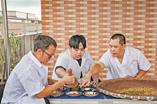 ■梁毅兴(右一)在指导徒弟学习膏药制作技艺。 |