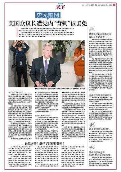 据新华社电 美国共和党以微弱优势掌控的国会众议院3日出现史无前例的一幕:该党8名众议员与民主党人一道,在罢免议长凯文·麦卡锡的表决中投下赞成票。 麦卡锡年初堪称“历尽艰辛”才当上众议院议长
