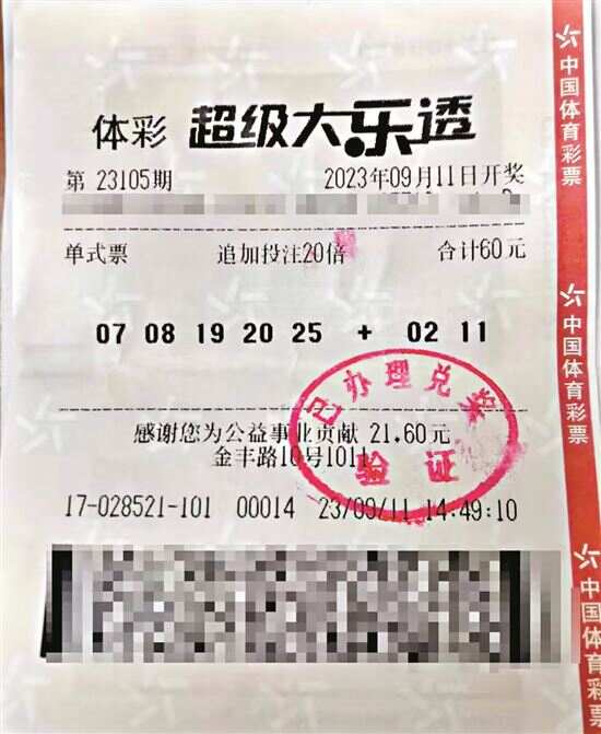 新快报讯 陆妍思 通讯员陈汝钰报道 东莞1.91亿元大奖得主,终于现身领奖啦!近日,大乐透第23105期20注追加头奖中奖者方先生(化姓)与妻子一同来到东莞市体育彩票管理中心处兑奖,并贡献个人偶然所得税3832万元。 “告诉爱人时,她怎么也不相信” 体彩超级大乐透第23105期开奖中,摇出中奖号码为:前区“07、08、19、20、25”;后区“02、11”。本期全国共中出26注一等奖。其中,22注为958万余元(含425万余元追加奖金)追加投注一等奖,东莞中出的20注,全部落户南城区金丰路10号1011的4417028521体彩实体店,中奖彩票为一张经20倍投注的单式追加票,投注金额60元,单票擒获奖金1.91亿元。 方先生说,中奖彩票是他在站点看着历史开奖号码信息随手写下1注号码,并按照往常的投注习惯,购买了一注追加20倍的大乐透彩票。 方先生表示,自己随后就到外地出差,工作一忙,便把开奖的事情忘了。直到开奖日期过了两天,工作的事情也暂告一段落,他才有空闲下来刷刷手机看新闻。 当他浏览东莞本地新闻,看到“东莞体彩中出1.91亿元大奖”标题的时候,忍不住点进去,竟发现中奖实体店店面的照片格外眼熟,方先生这才想起来,自己也在这家店买了张彩票。 方先生恍惚了一下,觉得自己随手写的号码不太可能中头奖,但心里还是抱着一丝期待。他翻出包里的彩票,核对了当期开奖号码,又重复确认几遍,终于确认1.91亿元大奖得主就是他自己! 方先生喜出望外,第一时间打电话告诉爱人,爱人怎么都不相信,以为丈夫是在开玩笑,直到方先生回到家后拿出彩票,才相信真的中了大奖。 “买彩票不要抱着一定中奖心态” 方先生介绍,自己30多年前就来到东莞创业,多年打拼下来,他已在东莞扎根生活,有着稳定的收入。喜欢购买体育彩票的他,最初就知悉自己买彩票的金额有一部分会作为体彩公益金,用于支持社会公益事业。“我比较喜欢超级大乐透的玩法,每当路过体彩实体店就会进去购彩,习惯采用追加10倍、20倍的投注方式,就算中了小奖也很开心!” 对于税后奖金的使用规划,方先生表示会先拿出一部分奖金缓解生意上的压力,再用一部分奖金来长期做公益,其余的奖金存着日后再规划。今后也会继续在东莞这片“风水宝地”购彩,让妻子一起加入公益行列。 面对爆出如此巨奖,不少网友纷纷表示羡慕,方先生也分享了他多年来的购彩心得:买彩票是锦上添花,不要抱着一定中大奖的心态,降低期待值会让你更轻松快乐。 广东体彩也温馨提醒广大购彩者,快乐购彩,理性投注。中大奖是小概率事件,要保持一颗平常心、娱乐心、公益心购彩。彩民所购买的每一张体育彩票,都会贡献一份彩票公益金。这些公益金用于补充全国社会保障基金、乡村振兴、教育助学、医疗救助、红十字事业等民生领域。