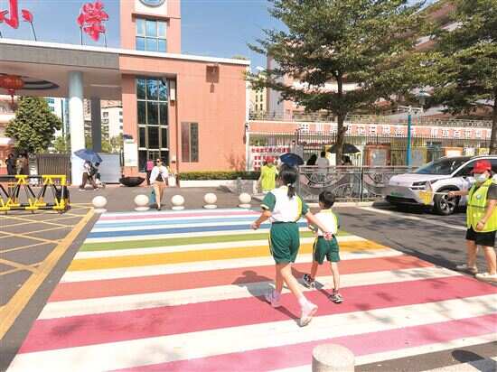 ■增城区荔江小学校门口的七彩斑马线。新快报记者 庄嘉宝/图 |
