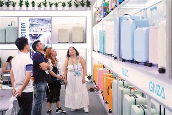■银座箱包的展位上,境外采购商正在挑选产品。 |