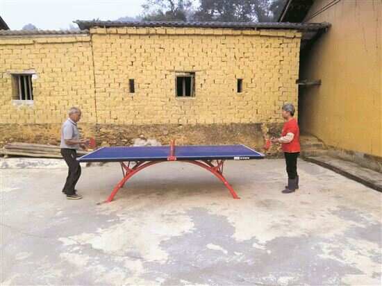 ■培崀村的肖伯(左)打起了乒乓球。 |