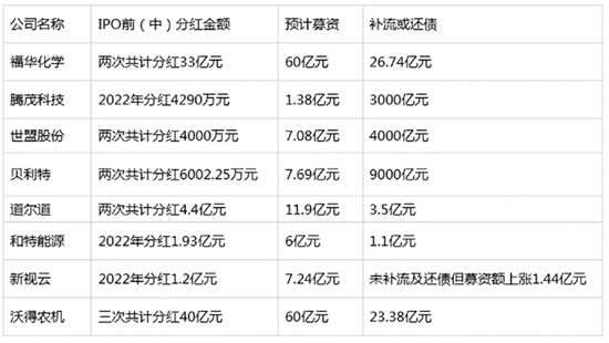 沃得农机分红40亿元,德华化学分了33亿元…… 新快报讯 记者张晓菡报道 在IPO发行节奏阶段性收紧的情况下,证监会和投资者对A股IPO中存在的问题更加关注。近几个月,因存在“左手分红、右手募资”的行为,福华化学、腾茂科技、世盟股份、贝利特、道尔道、和特能源、新视云、沃得农机等一众拟IPO公司引发市场质疑。 “把分红的钱再拿回来” IPO前“突击”分红的公司并不少见,但“清仓式分红”后马上就募资还债,就难免引发投资者的质疑和不满,日前,福华化学就因这一行为引发了市场较大争议。然而,有这种操作的并非福华化学一家,近期有不少公司因类似行为也被推上了“风口浪尖”。 据了解,沃得农机不仅在IPO前进行了约30亿元的大额分红,还在上市申报期内再度分红10亿元,该公司拟募资规模是60亿元。在更新招股书数据的过程中,沃得农机补充流动资金还从早期的20.03亿元变成了23.38亿元,在一片质疑声中,沃得农机终止了IPO。 无独有偶,新视云也存在分红后募资增加的情况。2020年7月,新视云IPO募集的资金为5.58亿元,2021年1月更新招股书时数据亦相同。然而,2022年7月,新视云进行了1.2亿元的分红,随后在今年6月新递交的招股书中,拟投资项目没增加的情况下,公司募集资金却增加至7.24亿元。 此外,还有公司的分红金额正好与补流金额相同。2021年及2022年,世盟股份进行了4000万元的分红,在该公司今年3月递交的招股书中,募集资金正好4000万元,用于补充运营资金。不少股民质疑该行为是“把分红的钱再拿回来”。 记者了解到,近期还有贝隆精密、腾茂科技、贝利特、道尔道、和特能源等一众拟IPO公司,均因分红问题被“揪出水面”,不少公司还被深交所问询,问询内容包括大额现金分红的原因及合理性、主要股东(尤其是实际控制人)取得分红资金的具体去向及客观支持证据、是否存在利益输送等。 “掏空”公司对股票投资者不公平 公司上市后的“分红”,是对广大股东的慷慨回报,而公司上市前的分红,由于获利方仅涉及公司创始人及少数早期投资者,因此大多数分红款会进入实控人“口袋”。 例如沃得农机实控人王伟耀、张阿美合计持有公司73.62%的股份,分红款也占到了公司总分红额度的近四分之三;道尔道两年共计分红4.4亿元,其实控人商文明直接和间接合计控制公司 85.71%的股份,也就是说,商文明拿走了超3.74亿元。 股民之所以抵制公司IPO前分红,因为在股民看来,IPO前分红就是实控人在圈钱。“不缺钱为何要募资?缺钱又为何要分红?”有股民指出,作为公司早期元老,实控人IPO前分红拿走属于自己的部分回报无可厚非,但不宜把公司掏个“底朝天”,公司IPO时利润、现金流等资产状况也是公司投资价值的一部分,大额分红对公司及认购股票的投资者不公平。 在专家看来,IPO前分红又进行募资的“合理性”是关键。IPG中国首席经济学家柏文喜表示,一些公司可能希望通过分红和募集资金来平衡股东利益和公司的长期发展的关系,也需要资金来扩大业务规模、提高研发能力及增加市场份额,公司需为未来发展预留一定资金以应对可能出现的风险和挑战,但也有一些公司可能存在财务造假等问题,因此,投资者可从该公司股东结构是否一家独大、业务模式和竞争优势、公司财务状况来判断分红合理性,了解市场对公司的认可程度和未来预期。