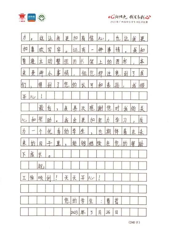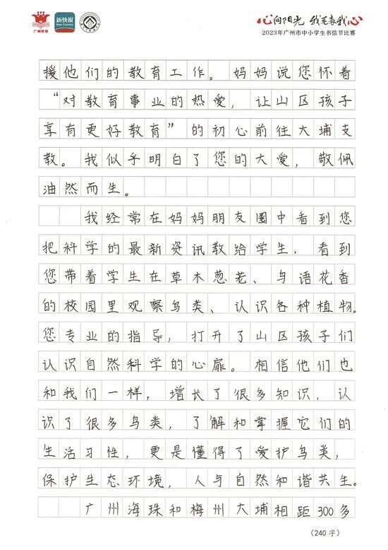 2023年广州市中小学生书信节比赛优秀作品鉴析① 自古师恩难忘,纸短难言情长。书信自古以来是抒发师生之情最常见的载体之一,在互联网飞速发展的今天,更多同学选择重拾这一浪漫的方式,表达对师恩的感激之情。 在本次由广州市教育局主办,共青团广州市教育局委员会、广东新快报社和广州市艺术中学联合承办的“心向阳光·我笔表我心·2023年广州市中小学生书信节比赛”一等奖作品中,多位参赛者选择了以“老师”作为写信的对象。无论学生来自哪个年级,无论孩子是活泼外放型还是内敛文静型,无论笔触是稚嫩朴实还是娴熟优美,笔尖之上表达的是更加酣畅淋漓和真挚难忘的师生情。 “我一直有个愿望:成为一名像徐老师那样的人民教师” 作者 文俊晴 书信是一种浪漫的表达 “我个人比较内敛,不善言辞,觉得笔墨更能表达我的想法和情感。”在本次书信节比赛中,文俊晴的参赛作品《忆往昔,念师恩;展未来,承师情》获得了一等奖,她以真挚的语言表达了对班主任徐琳老师的感激之情。 文俊晴告诉新快报记者,选择写信给老师是有感而发。“整个高三,徐老师给予我们的陪伴、关怀和指导,对我影响很大,也让我很感动。刚好有这个书信比赛,就借此机会写了一封信给她”。 文俊晴喜欢写作,上小学时就学会了写信。那时,她与父母在广州生活,而她的姐姐跟着爷爷、奶奶在老家生活,她常常通过书信和姐姐联系。“当时见面比较少,就在信里分享一些生活趣事,说一些悄悄话。现在想起来,这是很珍贵的回忆。”文俊晴说,她会将小时候写的一些东西收集起来,偶尔在家里翻出一些旧信件,就会很惊喜地一一打开来看。“我觉得信承载着我的感情,有时写信会比口头表达更加真挚”。 上了中学后,文俊晴写信的频率明显下降,但她对书信依然有特别的情结。“我一直认为书信是中国人的一种传统表达方式,很浪漫,所以想保留这样的习惯。”她说。 中学期间,文俊晴看过不少名人书信,比如《傅雷家书》等,使她感触良深。 文俊晴说,她一直有一个愿望,就是成为像徐老师那样的人民教师。“从小到大我遇到了很多好老师,他们是除了家人以外给过我很多爱和教导的人,我也想成为这样的人,把这种爱传递下去”。 指导老师 徐琳 有了书信,我和学生就可以双向沟通 徐琳是文俊晴的指导老师,也是她写信的对象。当看到文俊晴的作品时,徐琳直言“很感动”。徐琳说:“我是高三才带这个班,跟俊晴相处时间不算特别长,但从信中的字里行间,能感觉到她真挚的情感,很感动,也很欣慰。” 在徐琳的印象中,文俊晴是性格文静、爱写作的小女生,在班里成绩一直不错。对于俊晴的作品,她点评说:“内容符合主题,情感比较真挚,从结构和形式上说,也符合高中作文的结构模式,层次比较清晰。” 虽然人们在日常生活中渐渐少写信,但在徐琳看来,无论是在语文教学还是在日常交流中,书信仍起着非常重要的作用。“比如高三作文备考,书信就是学生必须掌握的一种文学体裁;而在人与人的日常交流中,很多时候用口头语言比不上文字表达得深刻和真挚。” 徐琳认为,在孩子的成长过程中,情感的表达非常重要,而书信往往可以发挥积极的作用。“开家长会的时候,我会向家长们提及,对于高中生来说,口头交流他们不一定愿意听,但如果借助书信的方式,孩子们可能更清楚家长的想法,也更容易接受建议。而我也鼓励学生们,如果有一些难以言说的心里话,可以通过书信的方式和家长交流。” 徐琳说,自己偶尔也会收到学生的手写信。“在教师节或考试前后,会有学生写了信放在我的办公桌上,向我倾诉心中的想法。我看完也会给他们一些反馈,这样就完成了一次双向的沟通”。 广州市增城区荔城中学副校长 单国坚 书信中流淌的情谊更深刻绵长 在本次书信节比赛中,广州市增城区荔城中学有不少学生获奖。副校长单国坚介绍,该校通过图书馆和班级图书角创造读书氛围,每学期举办读书分享会和读书主题竞赛活动,以此来培养学生的阅读习惯。“在以读促写的同时,鼓励学生积极参加各级各类征文活动。学校也会开设荔风儒韵特色课程,通过学科渗透、主题活动等形式,让同学们的校园生活受到优秀传统文化的浸润”。 “古人云:尺牍书疏,千里面目。指的是从书信中可以看到文笔之美、书法之功,更能感受到一份亲切感。对比现代化的通信方式,写信显得更加委婉,更易于表达感情,也更具有传统书香的文化韵味。”单国坚认为,在物质生活日益丰盈的当下,对情感厚度和精神家园的渴望,已经成为一种普遍的社会需要。虽未谋面,但文字中流淌的情谊显得那样深刻、绵长、温馨。“慢生活”的手写书信日渐成为“奢侈品”,需要大家精心呵护。 在单国坚看来,中小学生书信节比赛以撰写书信的方式,让中小学生积极主动向父母、老师、亲朋好友或者自己倾诉自我成长中的真情实感,营造了积极、健康、阳光、和谐的家校协同育人环境,有利于学生的身心健康成长。他表示:“本次书信节比赛活动传承‘心向阳光·我笔表我心’的温暖情怀,让学生们从一封封信件中懂得爱、体会爱、收获爱,同时也让他们从一封封信件中看到一个远方的世界,激励他们相互欣赏、相互学习、共同进步。” “老师更像是朋友,默默鼓励我、帮助我” 作者 杜乐贤 阅读开启了我尝试写作的旅途 “