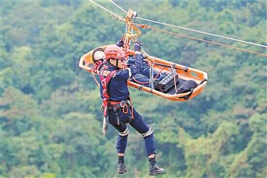 ■红棉老兵飞翔应急救援志愿服务队展示高空伤员担架转运。 新快报记者 郭思杰/摄 |