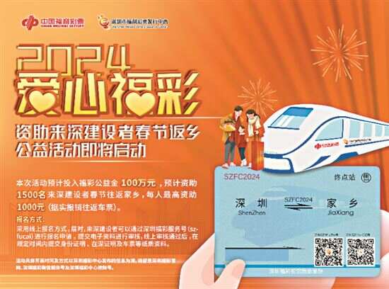 新快报讯 记者陆妍思 通讯员邓雪玲报道 记者12月13日从深圳市福彩中心获悉,深圳福彩即将开展2024年“爱心福彩·资助来深建设者春节返乡”公益活动,本次活动预计投入福彩公益金100万元,预计资助1500名来深建设者春节往返家乡,每人最高资助1000元(据实报销往返车票)。 秉承着“扶老、助残、救孤、济困”的发行宗旨,深圳福彩积极参与社会公益事业,多年来坚持举办关爱来深建设者公益活动,为来深建设者送上鹏城温暖。其中,“爱心福彩·资助来深建设者春节返乡”公益活动连续开展17年,投入福彩公益金约3600万元,资助来深建设者春节返乡约6.8万人;“爱心福彩·常回家看看”已连续开展5年,累计资助超过6000名来深建设者日常返乡探亲,资助金额超450万元。 本次“爱心福彩·资助来深建设者春节返乡”公益活动与往年不同的是,不再直接为来深建设者提供返乡车票,而是采用车票报销的方式,为来深建设者报销春节往返家乡的车票票额,让来深建设者可以更加自由地安排往返家乡的行程。活动具体开展时间及方式以深圳福彩发布的信息为准,想要报名参加活动的来深建设者请留意深圳福彩官网、深圳福彩微信服务号。