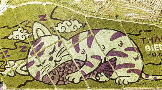这是12月30日在泰国清莱拍摄的以猫为图案的巨型稻田画(无人机照片)。近日,泰国清莱艺术家在当地稻田中创作了三幅以猫为图案的巨型稻田画,吸引游人前来观看。 新华社发