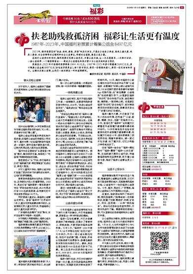 1987年-2023年,中国福利彩票累计筹集公益金8497亿元 2023年,福利彩票坚持“扶老、助残、救孤、济困”的发行宗旨,不遗余力地助力养老、孤残儿童关爱、残疾人救助、社会保障等社会福
