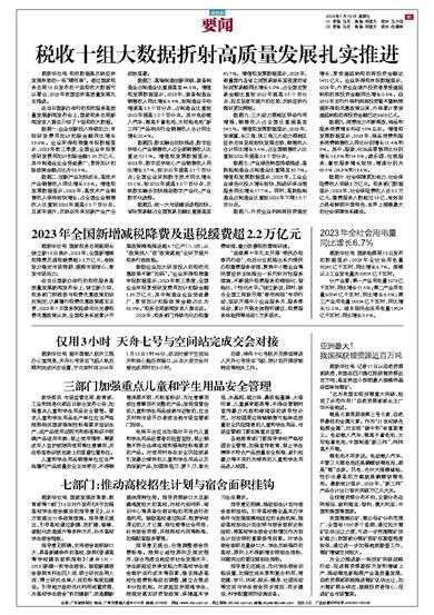 据新华社电 税收数据是反映经济发展形势的一张“晴雨表”。透过国家税务总局18日发布的十组税收大数据可以看出,2023年我国经济高质量发展扎实推进。 在当日国新办举行的税收服务高质量发展新闻