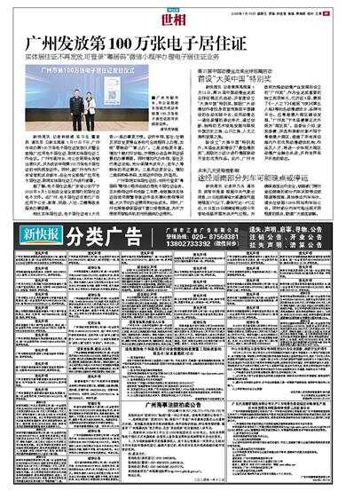 实体居住证不再发放,可登录“粤居码”微信小程序办理电子居住证业务 新快报讯 记者林钢威 实习生 董宣辰 通讯员 公新文报道 1月17日下午,广州市举办第100万张电子居住证发放仪式暨全面推
