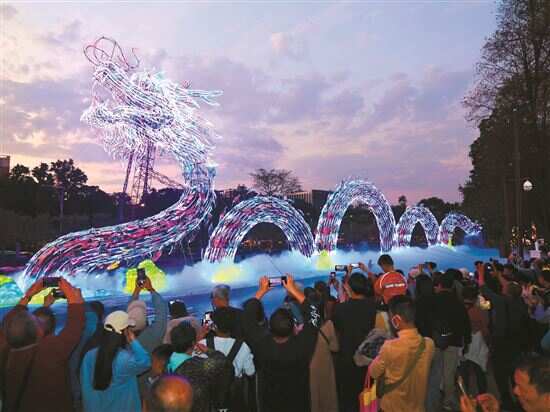 ■2日傍晚,越秀公园的百米巨龙亮灯,迎来众多市民前来观赏。 |