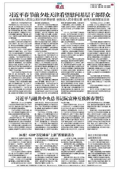 向全国各族人民致以美好的新春祝福 祝各族人民幸福安康 祝伟大祖国繁荣昌盛 据新华社电 中华民族传统节日春节即将到来之际,中共中央总书记、国家主席、中央军委主席习近平来到天津,看望慰问基层干