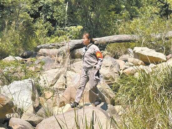 ■3月5日,庞梅兰顶着烈日在霸王岭沟谷河滩上行走。 |