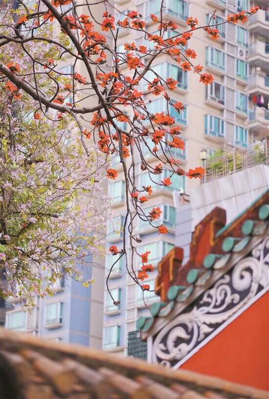 ■农讲所,绽放的木棉和红墙黄瓦、殿檐斗拱相映成趣,美不胜收。 |