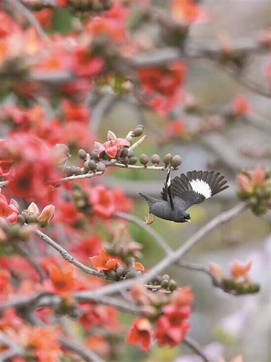 ■农讲所盛开的木棉花里,有不少鸟儿在其中穿梭。 |