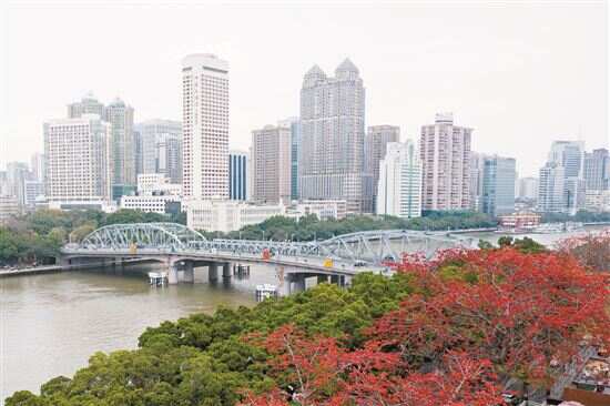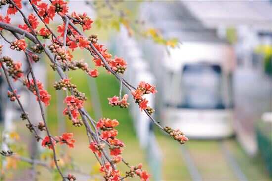 ■猎德大桥南,有轨电车与木棉花同框,春天的气息扑面而来。 |