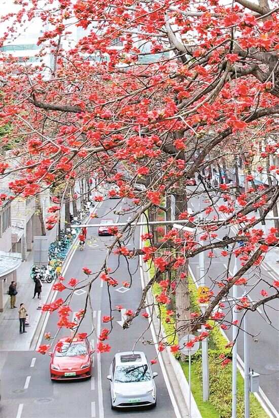 ■陵园西路,盛开的木棉花犹如一片片红云,将整条路铺满。 |