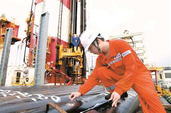 ■作业人员在开平南油田“深蓝探索”钻井平台上测量套管(2023年9月12日摄)。 |