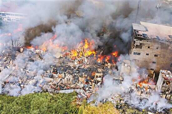 这是3月19日在菲律宾奎松市拍摄的火灾现场(无人机照片)。