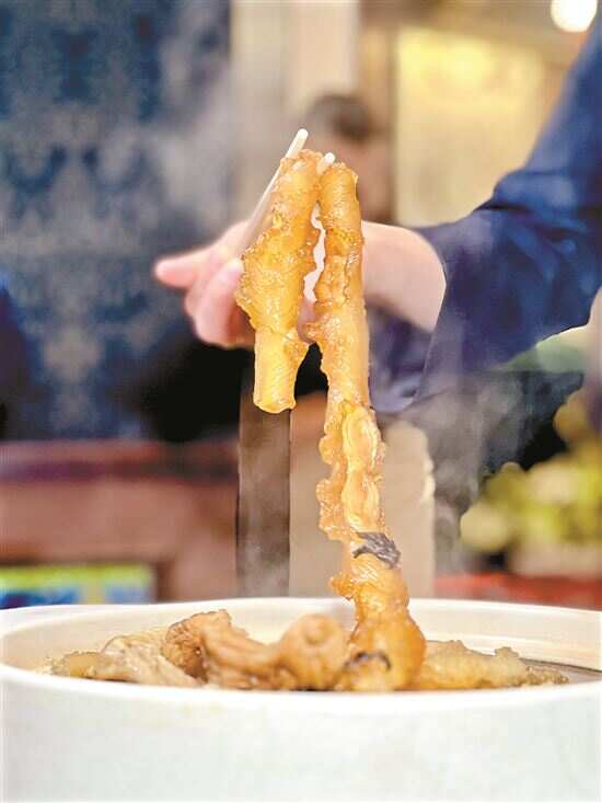 取养殖7年的鲟龙鱼脊髓,与瑶柱、走地鸡、石耳、鹿竹等同煲4小时,汤色清澈而汤味鲜甜浓厚。 |