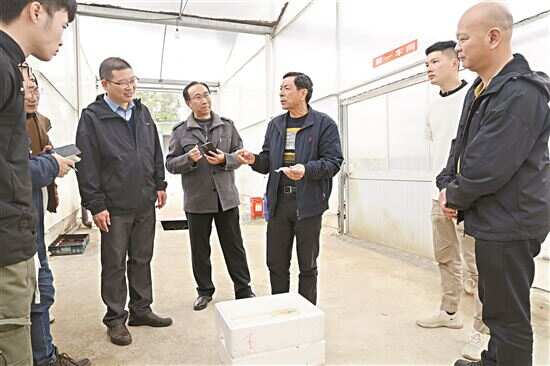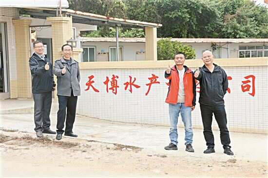 ■阳东区乡村振兴局常务副局长梁永链(左一)与区、镇农业农村部门相关负责人一起为天博水产科技公司点赞。 |